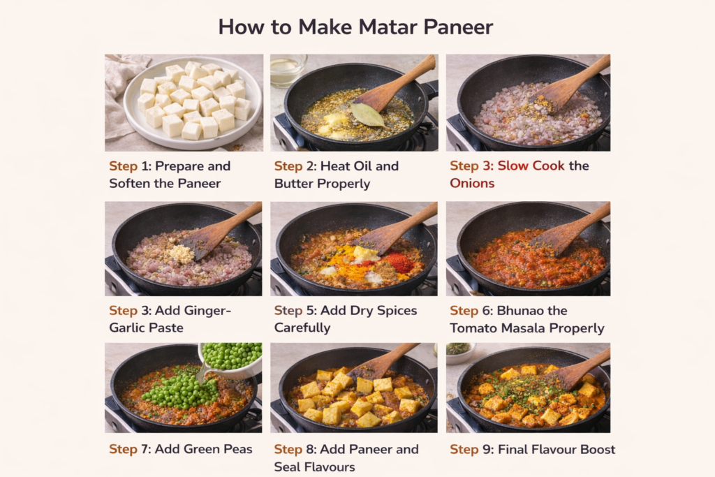 This bhunao process is the most important step for restaurant-style matar paneer. Cook until the masala thickens, turns glossy, and oil starts releasing from the sides. This may take 7–10 minutes, depending on the moisture in tomatoes.